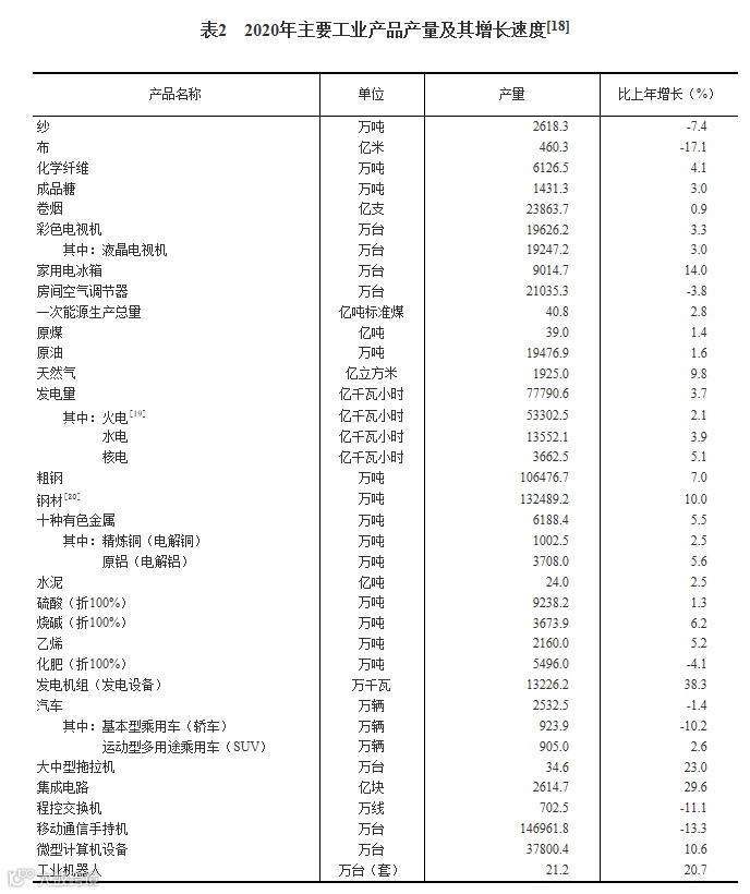 [17]东部地区是指北京、天津、河北、上海、江苏、浙江、福建、山东、广东和海南10省(市);中部地区是指山西、安徽、江西、河南、湖北和湖南6省;西部地区是指内蒙古、广西、重庆、四川、贵州、云南、西藏、陕西、甘肃、青海、宁夏和新疆12省(区、市);东北地区是指辽宁、吉林和黑龙江3省。[18]2019年部分产品产量数据进行了核实调整,2020年产量增速按可比口径计算。