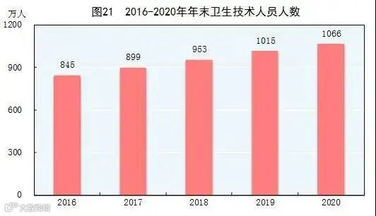 年末全国共有医疗卫生机构102.3万个,其中医院3.5万个,在医院中有公立医院1.2万个,民营医院2.4万个;基层医疗卫生机构97.1万个,其中乡镇卫生院3.6万个,社区卫生服务中心(站)3.5万个,门诊部(所)29.0万个,村卫生室61.0万个;专业公共卫生机构1.4万个,其中疾病预防控制中心3384个,卫生监督所(中心)2736个。年末卫生技术人员1066万人,其中执业医师和执业助理医师408万人,注册护士471万人。医疗卫生机构床位911万张,其中医院713万张,乡镇卫生院139万张。全年总诊疗人次[62]78.2亿人次,出院人数[63]2.3亿人。截至年末,全国累计报告新型冠状病毒肺炎确诊病例87071例,累计治愈出院病例82067例,累计死亡4634人。全国共有8177家医疗卫生机构提供新型冠状病毒核酸检测服务,总检测能力达到1153万份/天。