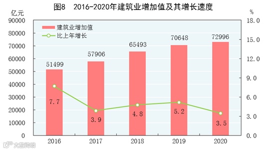 全年全社会建筑业增加值72996亿元,比上年增长3.5%。全国具有资质等级的总承包和专业承包建筑业企业利润8303亿元,比上年增长0.3%,其中国有控股企业2871亿元,增长4.7%。