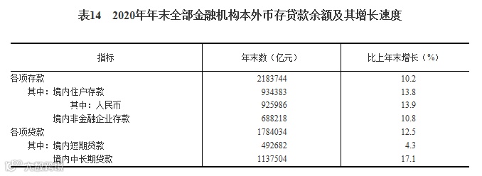 全年社会融资规模增量[40]34.9万亿元,按可比口径计算,比上年多9.2万亿元;年末社会融资规模存量[41]284.8万亿元,按可比口径计算,比上年末增长13.3%,其中对实体经济发放的人民币贷款余额171.6万亿元,增长13.2%。年末全部金融机构本外币各项存款余额218.4万亿元,比年初增加20.2万亿元,其中人民币各项存款余额212.6万亿元,增加19.6万亿元。全部金融机构本外币各项贷款余额178.4万亿元,增加19.8万亿元,其中人民币各项贷款余额172.7万亿元,增加19.6万亿元。人民币普惠金融贷款[42]余额21.5万亿元,增加4.2万亿元。