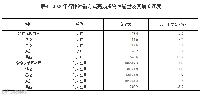 [24]货物运输总量及周转量包括铁路、公路、水路和民航四种运输方式完成量,2020年增速按可比口径计算。因新组建国家管网集团,部分油气运输管线统计归口发生变化等原因,管道运输相关数据尚在核实。