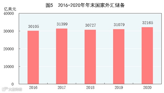 年末国家外汇储备32165亿美元,比上年末增加1086亿美元。全年人民币平均汇率为1美元兑6.8974元人民币,比上年升值0.02%。