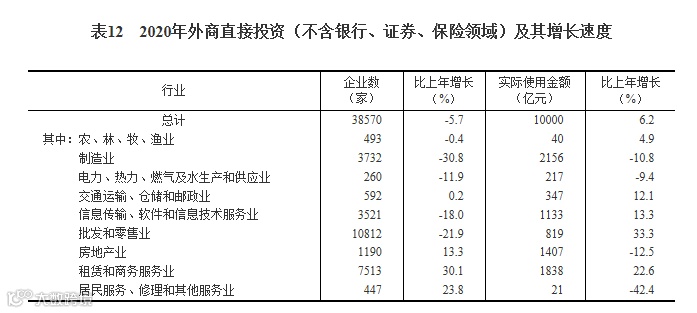 全年外商直接投资(不含银行、证券、保险领域)新设立企业38570家,比上年下降5.7%。实际使用外商直接投资金额10000亿元,增长6.2%,折1444亿美元,增长4.5%。其中“一带一路”沿线国家对华直接投资(含通过部分自由港对华投资)新设立企业4294家,下降23.2%;对华直接投资金额574亿元,下降0.3%,折83亿美元,下降1.8%。全年高技术产业实际使用外资2963亿元,增长11.4%,折428亿美元,增长9.5%。