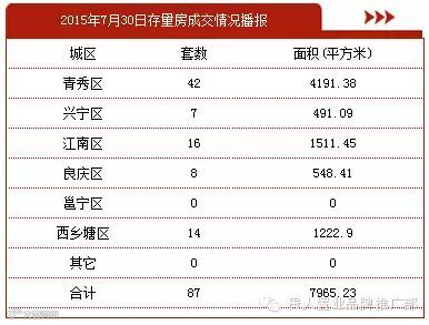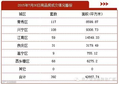 2015年7月30日,南宁商品房签约392套,签约面积42667.74平方米。其中,青秀区117套,兴宁区108套,江南区59套,良庆区31套,邕宁区9套,西乡塘区68套。