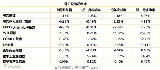 商品市场。国际原油延续弱势,铜、黄金等金属小幅震荡。国内商品分化,黑色品种继续走弱,螺纹、热卷等成材下跌,焦炭、铁矿等原材料亦走弱,能化品种普遍下跌,有色亦走弱,镍、铝等下挫。农产品小幅震荡。商品市场近段时间表现出一定趋势,工业品出现明显下跌,农产品上涨动力较强。