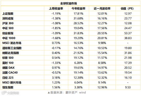 股票市场。上周A股高开低走,上证指数下跌超过1%。中小创跌幅较大,中证500下跌1.85%,中证1000下跌1.68%。有色、采掘、化工等周期板块及电子、通信等成长板块跌幅较大,传媒、医药生物表现较强。随着市场下跌,市场情绪回落,全市场日均成交额逐步回落,股指期货贴水率增大。整体来看,当前A股在一个大的区间震荡,行业结构分化。