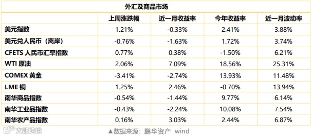 债券市场。上周央行小幅回笼35亿,其中开展4000亿1年期MLF,有4035亿MLF到期。央行下调MLF利率5BP,超市场预期,市场流动性处于较高水平,货币资金利率下行,DR007下行3.35BP至2.4651%。国债期货上涨,国债收益率略上行,10年期国债收益率上行0.08BP,国开债收益率整体下行。信用债收益率下行,信用利差普遍收窄。周末披露的CPI数据超预期,但核心CPI及PPI保持稳定或回落。央行在数据披露前超预期降息,债市走强。