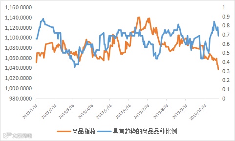 商品策略。上周工业品震荡趋弱,农产品小幅震荡滞涨。和上周相比,商品市场具有趋势的品种比例回落。近段时间来农产品持续走强,对商品趋势策略有提振。不过就工业品而言,由于中外经济周期的错位以及国内较弱的库存周期,商品内部分化,长期看整体趋势性可能并不强。