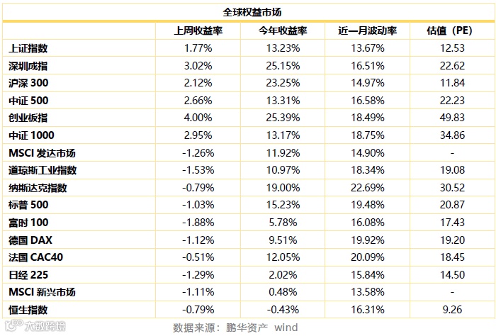 股票市场。上周A股底部反弹,在全球市场普跌情况下一枝独秀。上证指数上涨1.77%,中证500上涨2.66%,创业板上涨4%。电子、计算机、医药生物、通信等成长板块大涨。银行板块下跌略拖累大盘。市场风格近来切换,科技等成长股受到市场青睐,资金不断流入。市场热点不断扩展,个股表现活跃。政策层面央行宣布改革LPR形成机制,有利于降低企业实际利率,中央宣布支持深圳建设中国特色社会主义先行示范区,改革开放持续深入,有利于提振市场情绪,A股在前期中枢支撑下机会较多,如果流动性改善,A股或可延续一季度上涨趋势。