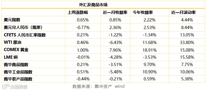 商品市场。上周商品小幅震荡。国际原油、铜等均震荡,黄金冲高回落。经历前期下跌后,黑色系小幅反弹回落。有色、能化等品种均震荡,农产品分化,前期上涨趋势品种亦高位盘整。在全球经济处于较弱环境下,贸易摩擦对市场信心形成进一步冲击,商品情绪整体低落。在不确定加大局面下,黄金等贵金属的配置价值凸显。