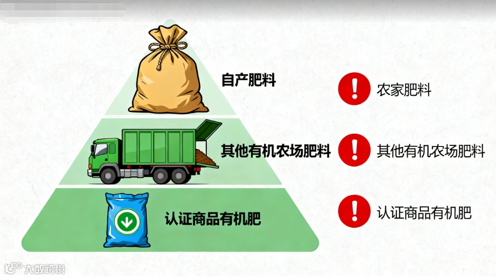 外购商品有机肥必须经过认证机构审核,确保不含任何禁用物质 即便是优质有机肥,也要避免过量使用,防止造成水体富营养化 不应在叶菜类、块茎类和块根类植物上施用人粪尿