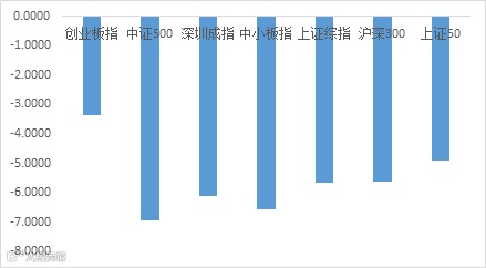上周A股大跌调整,上证指数大跌5.64%。除农林牧渔等少数板块外,其余行业板块均大跌。上证50下跌近5%,沪深300下跌5.61%,中证500下跌近7%,创业板指下跌3.38%。