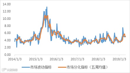 上周个股间分化处于高位,全周下来个股间分化指标仍处在高位。