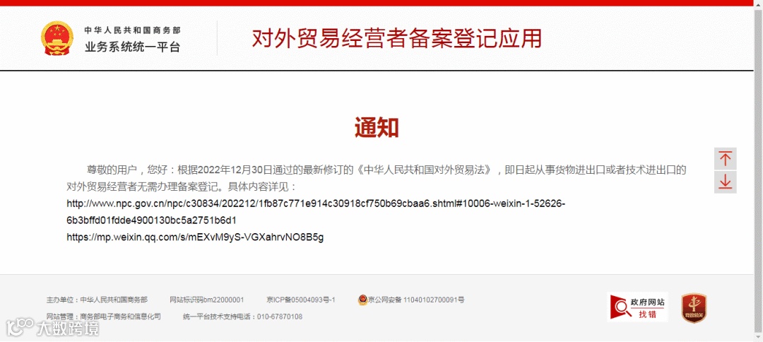 自2022年12月30日起,各地商务主管部门停止办理对外贸易经营者备案登记。