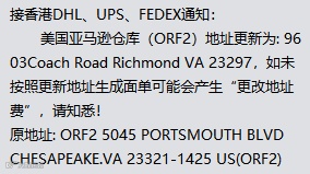 美国亚马逊仓库(ORF2)地址更新为: 9603Coach Road Richmond VA 23297,如未按照更新地址生成面单可能会产生“更改地址费”,请知悉!