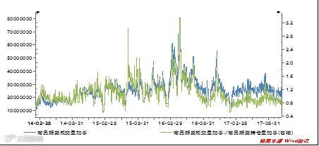 从全市场成交及持仓情况来看,上周成交量略有上升,持仓量保持稳定,成交持仓比上升。