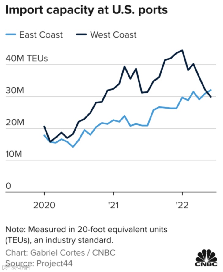美西港口拥堵和工人罢工的危机迫使美国进口货物由美西转向美东。