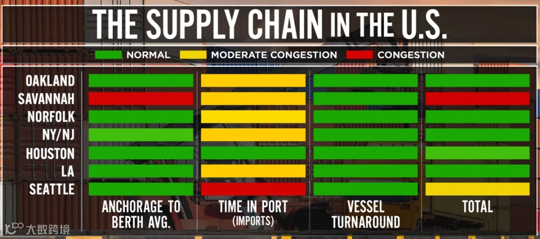 目前纽约-新泽西港船舶候港时间超过20天,萨凡纳港候港时间要10到20天。
