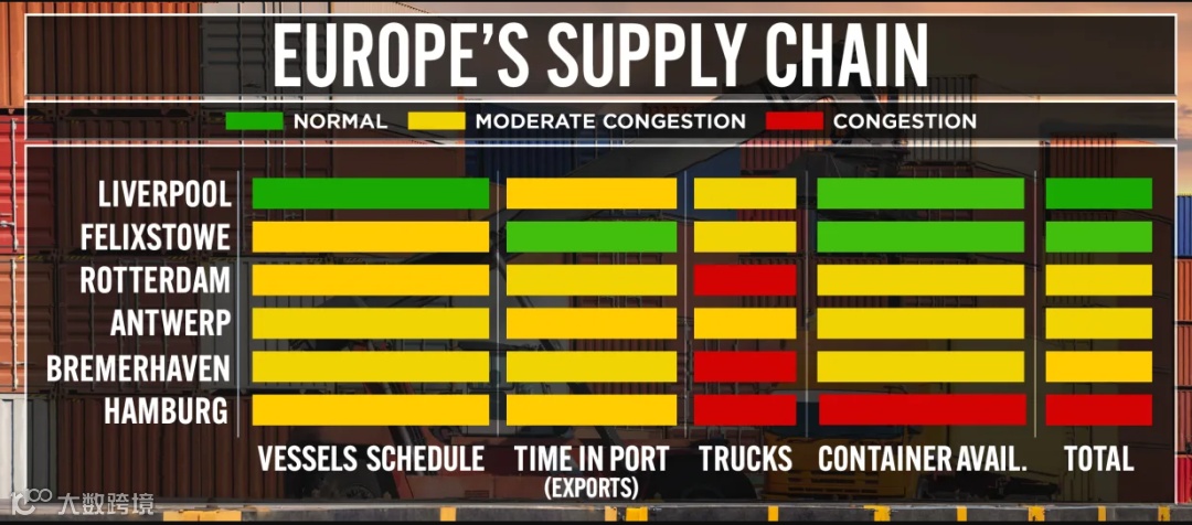目前欧洲港口的拥堵状况将需要8周多的时间才能清除,并且只会随着僵局的加剧而加剧。这些等待出口的集装箱包括汽车、汽车零部件、宜家家具和家居用品。
