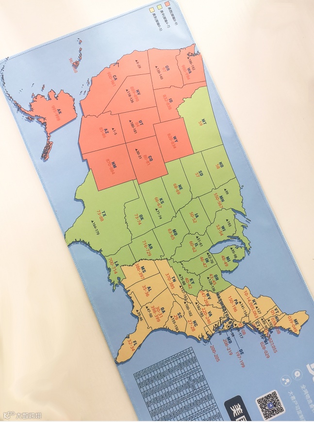 根据美国各州邮编,以颜色划分为“美西/美中/美东”