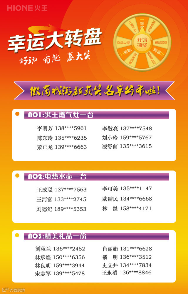 火王厨电『幸运大转盘』获奖名单现在揭晓!一起来瞧瞧转盘上的幸运奖品究竟花落谁家吧。恭喜以下幸运的火粉!