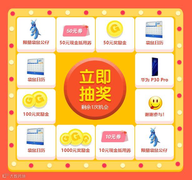 华为P30 Pro一部,1000元奖励金100份,100元奖励金1000份,50元奖励金2000份,50元现金抵用券500份,10元现金抵用券1000份,袋鼠公仔限量100份,袋鼠日历5000份,合计万份礼品,等你来拿!