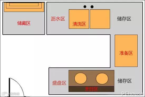 准备区用来放砧板等工具、切菜准备的区域,忙起来东西最多,所以长度至少要60cm以上;而沥水区和盛盘区分别是水槽到墙边的距离、灶台到墙边的距离,建议条件允许的话分别保留至少30cm的位置。