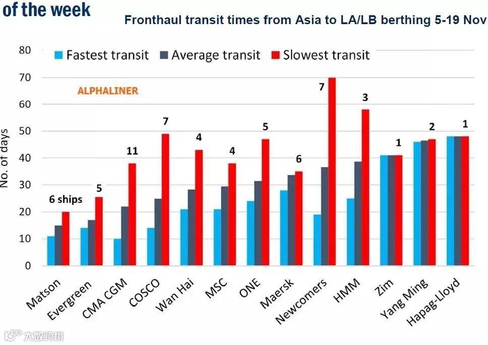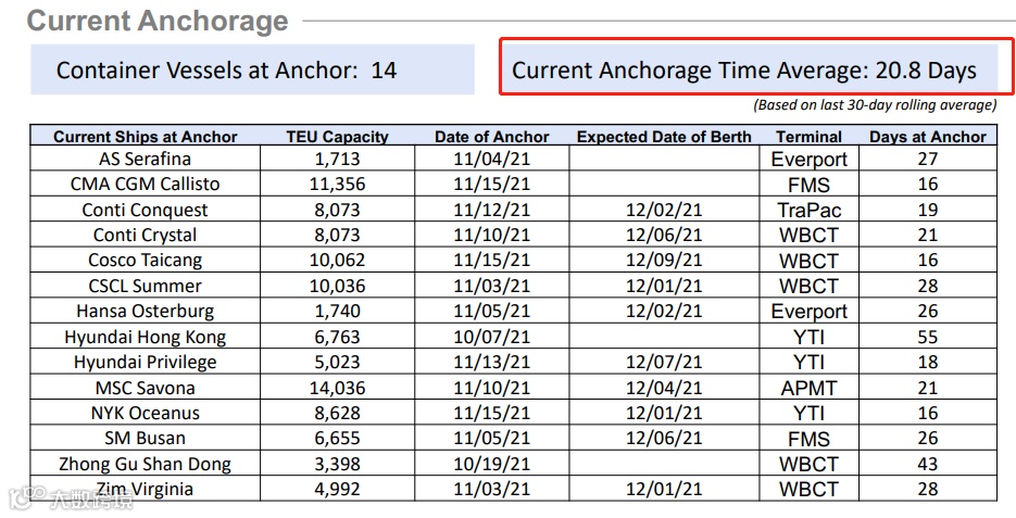 其次,洛杉矶和长滩港外的集装箱船等候时间已经延长到20.8天了。