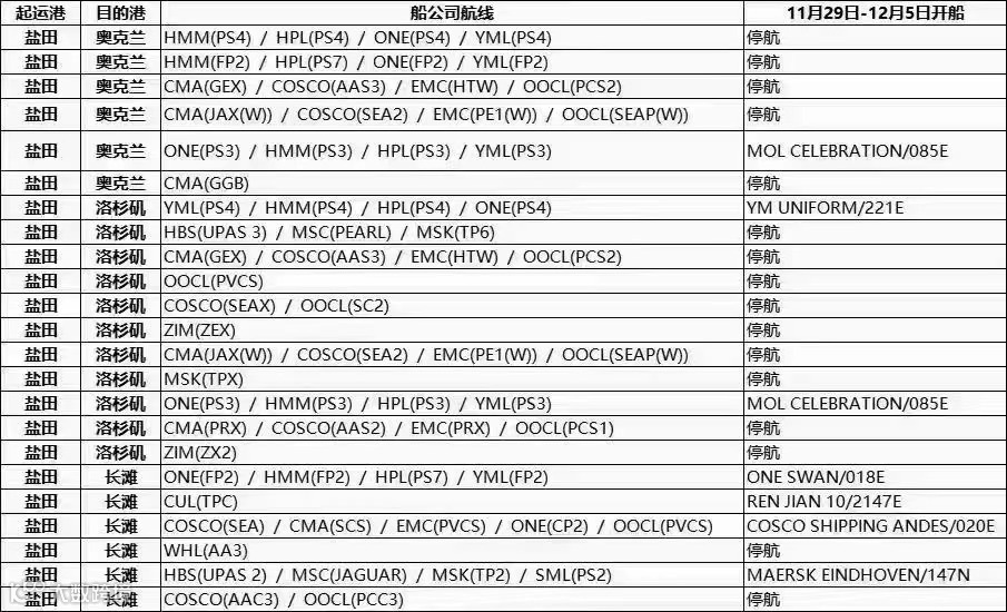 根据德鲁里26日最新发布数据,接下来的4周(第48-51周)里全球三大航运联盟陆续取消了多个航次。
