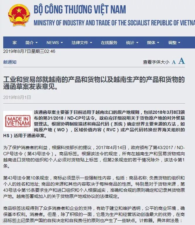 越南财政部颁布第62/2019/TT-BTC号公告补充、修正第38/2018/TT-BTC号公告,有关确认进出口货物的产地。第62/2019/TT-BTC号公告自2019年10月21日起生效。如:若商品经在越南最后加工阶段制成,需满足符合有关商品代码(HS)转换规定以及境内新增价值比率达30%以上等条件,才能标示“越南制造”。