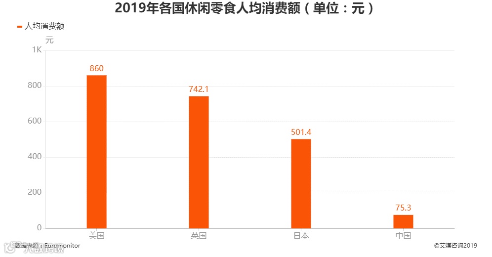 2019年美国零食人均消费额高达860元,英国为742.1元,而我国仅为75.3元。就连与我国社会和饮食文化最接近的日本,零食人均消费额也高达501.4元,是我国的6倍多。