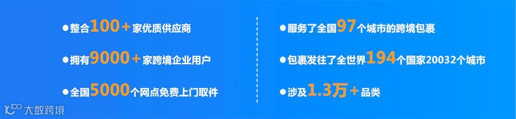 目前平台已整合100+家优质供应商,有10000+家跨境企业用户,全国5000个网点免费上门取件。2017年平台服务了全国97个城市的跨境包裹,发往全世界194个国家20032个城市,涉及品类1.3万+。