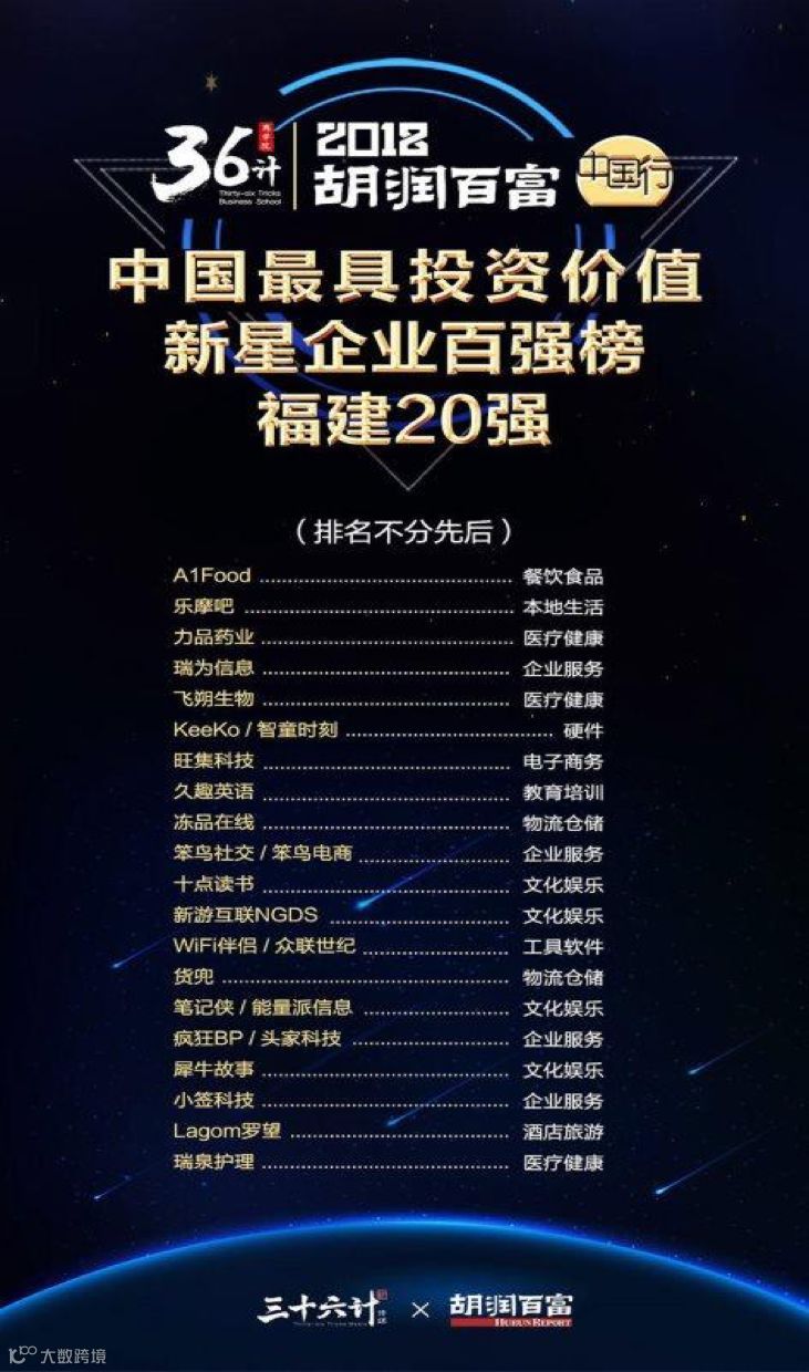 2018年3月28日,由36计、胡润百富共同发布的《2018胡润百富中国最具投资价值新星企业百强榜福建20强》在福建福州贵安世纪金源大饭店重磅揭晓。