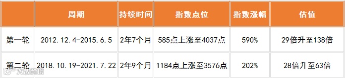 2010年6月推出至今,创业板历史上经历过两轮大牛市,分别是2012年底-2015年中、2018年底-2021年中。