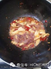 7.将鸡肉和牛肉下锅,加少许盐,勾芡炒至转色即可。
