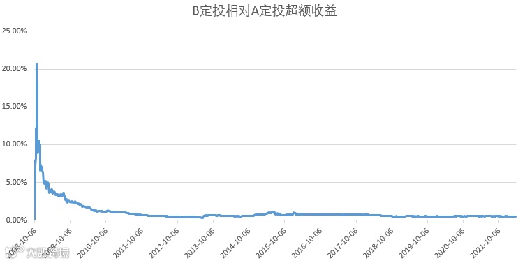 B和A的定投收益率之差,随着时间拉长,趋近于0。