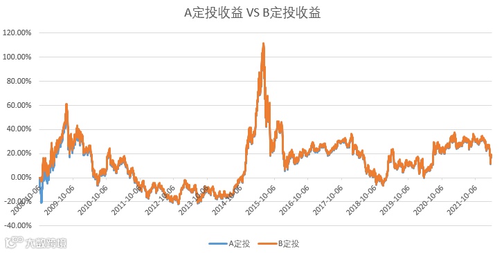 可以看到,A和B的定投收益率曲线几乎是重合的。