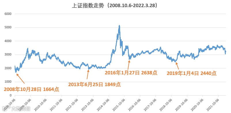 A和B从2008年10月开始定投上证指数,期间经历了1664点、1849点、2638点、2440点等4个大底。