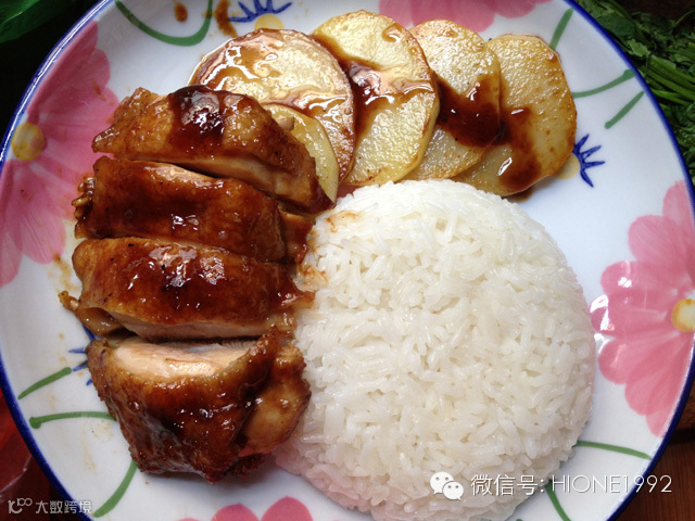11. 饭盛好,摆上土豆片,鸡肉切块装盘