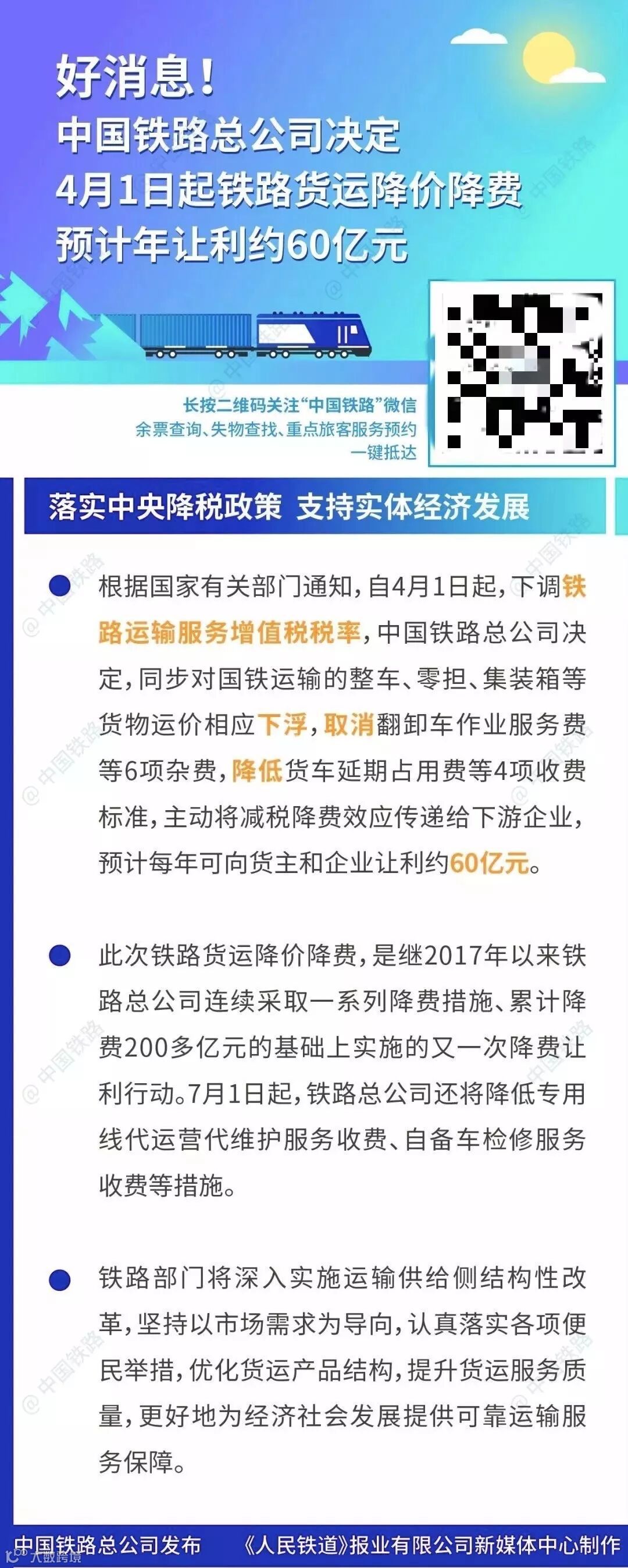 3月31日从中国铁路总公司获悉:自4月1日起,铁路部门将下浮铁路货物运价,取消和降低部分货运收费。