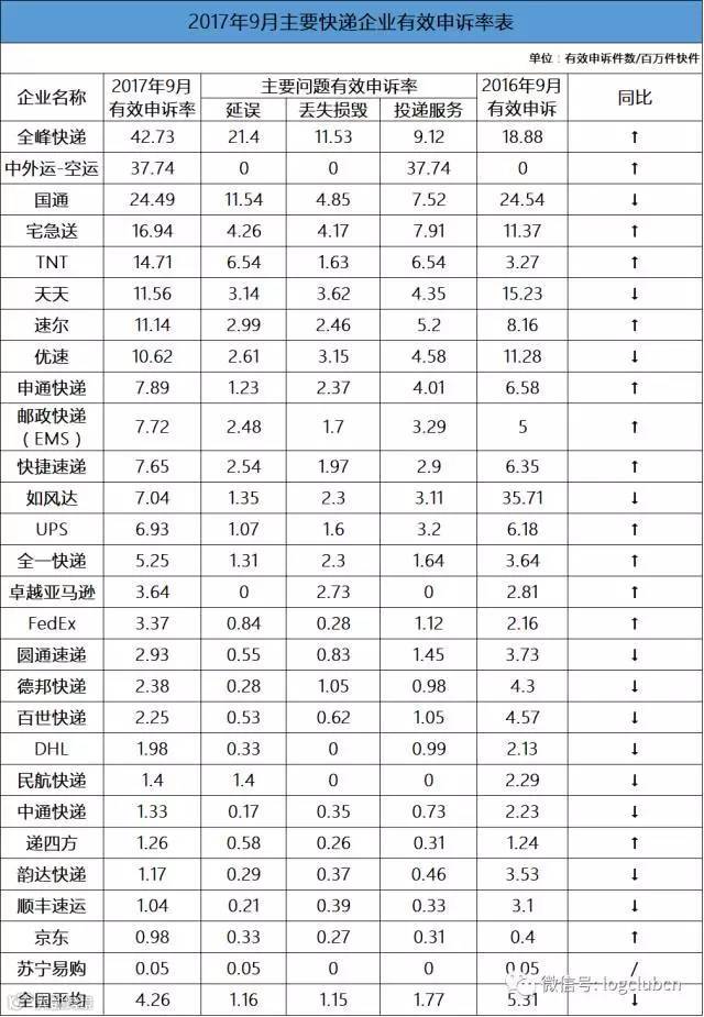 2017年9月,消费者对43家快递企业进行了有效申诉,全国快递服务有效申诉率为百万分之4.26,环比增加0.18,同比减少1.05,高于全国平均有效申诉率的快递企业有14家。
