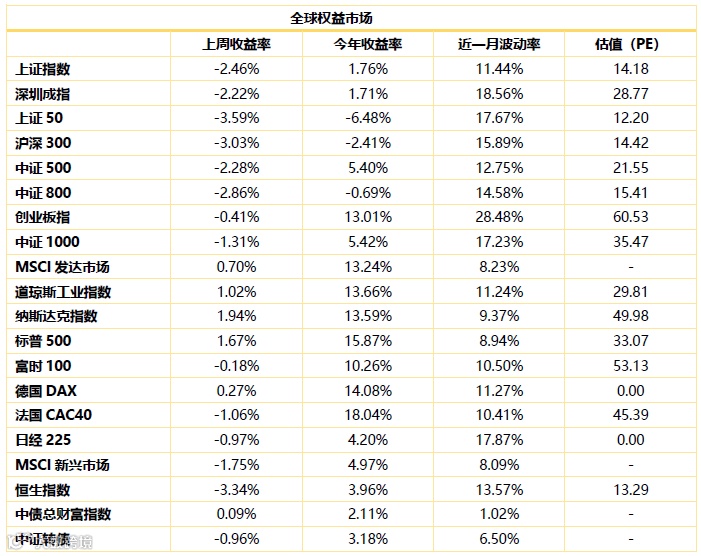 全球市场观察。上周全球主要经济体股市涨跌不一,美国纳斯达克上涨1.94%,标普500上涨1.67%。德国DAX上涨0.27%、法国CAC40下跌1.06%,富时100下跌0.18%。亚洲市场,日本日经225指下跌0.97%,香港恒生指数下跌3.34%。