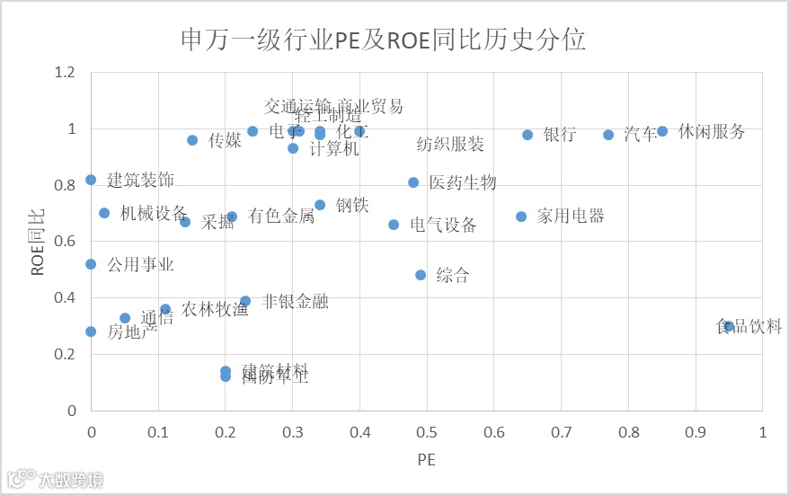 从历史PB角度分析,食品饮料以及休闲服务等行业处于历史估值分位数的高位,房地产、采掘、公用事业、银行以及建筑装饰等行业处于历史估值的底部。
