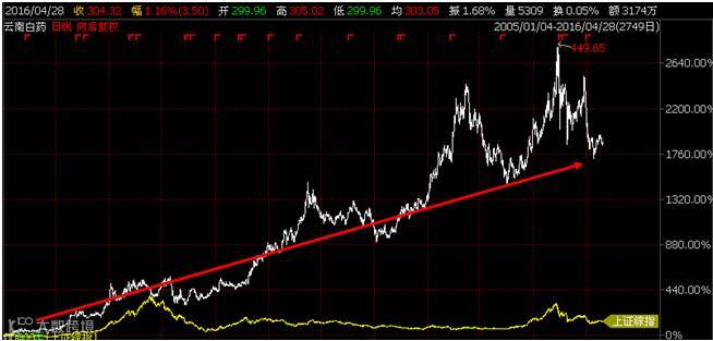 如果你在2005年1月4日开始用云南白药牙膏,你觉得中药牙膏有亮点,就买了10万元的云南白药股票(000538,50元/股),你的最新回报为196.61万元(2016.4.26)。