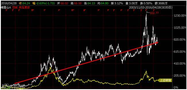 如果你在2003年11月13日错峰出游,花1万元带全家人去峨眉山玩。同时又买了1万元的峨眉山A(000888,7.83元/股)的股票,现在价值10万元(2016.4.26)。