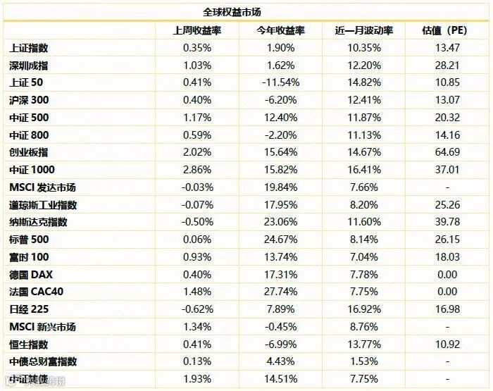 全球市场观察。上周欧美主要经济体股市普遍小幅震荡,美国纳斯达克下跌0.50%,标普500上涨0.06%。德国DAX上涨0.40%、法国CAC40上涨1.48%,富时100上涨0.93%。亚洲市场,日本日经225指数下跌0.62%,香港恒生指数上涨0.41%。