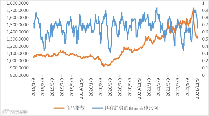 商品策略。具有趋势效应的商品下降至65.63%,商品指数出现明显回落。目前可以考虑配置CTA策略。
