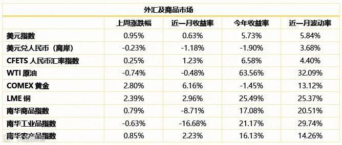 商品市场综述:上周国内商品市场小幅震荡。南华商品指数上涨0.79%,南华工业品指数下跌0.63%,南华农产品指数上涨0.85%。WTI原油下跌0.74%,COMEX黄金上涨2.80%,LME铜上涨2.39%。