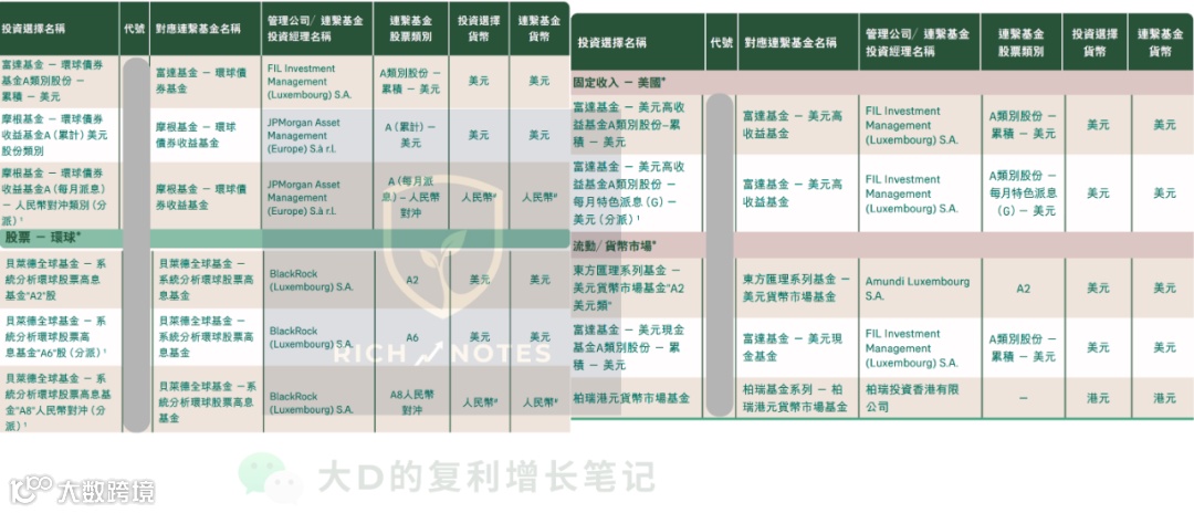 • 四大资产类别:股票类、固定收入类、流动/货币市场、多元资产。 -