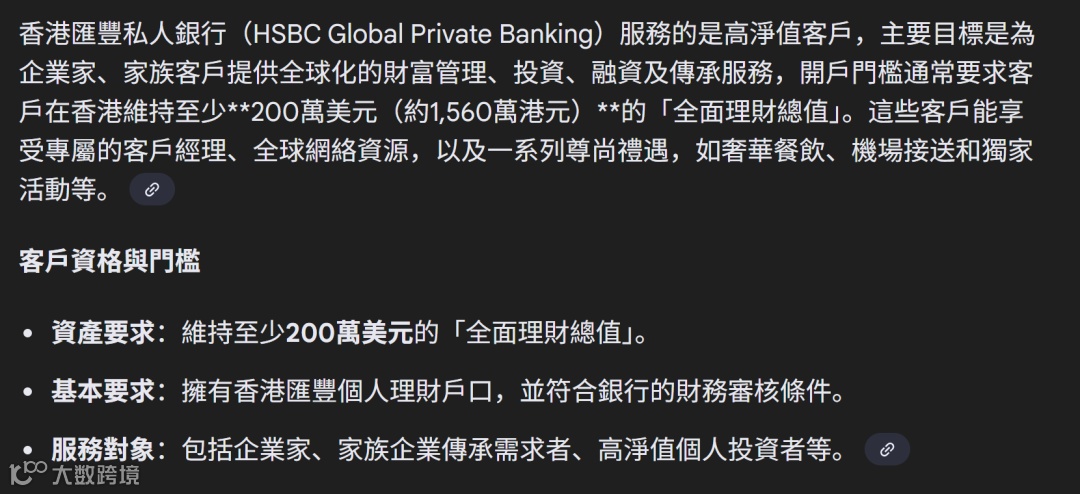 例如,香港汇丰的私行客户门槛是维持至少200万美元的资产。